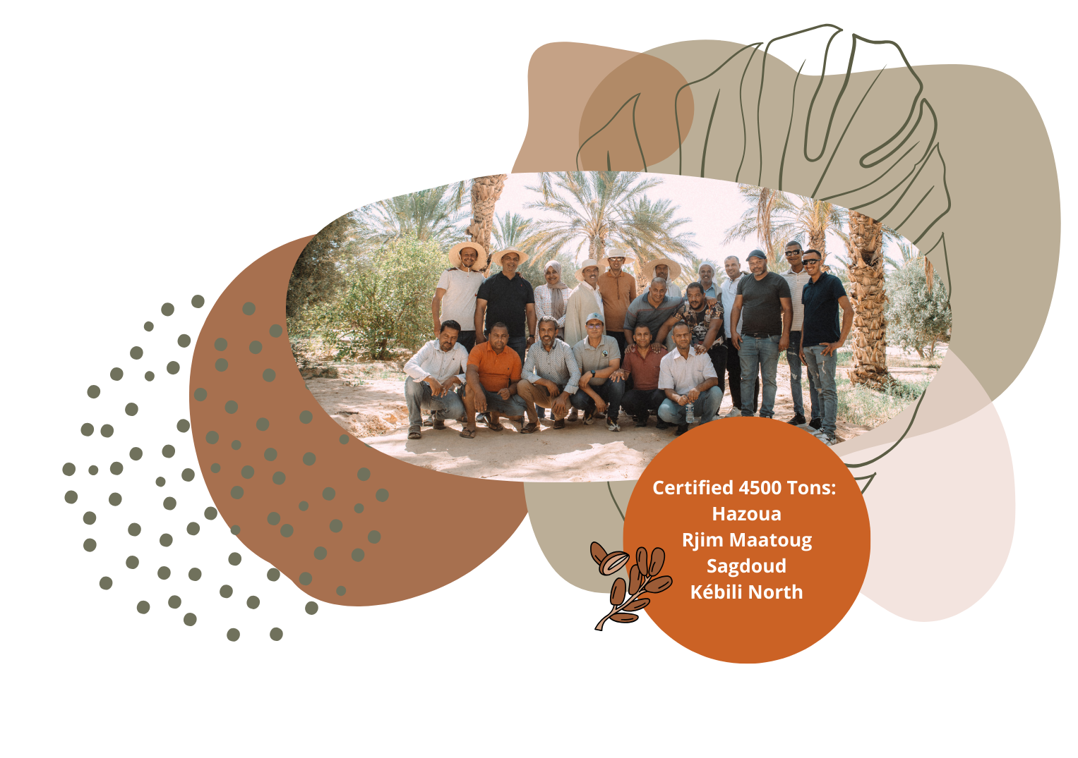 The farmers who are members of the Boudjebel project are located in 3 large areas in southern Tunisia: Tozeur, Gafsa and Kébili. The company established its first base of farmers in Hazoua (Tozeur) in 2004 and began to implement its organic production practices in 2007, reaching in 2025 a potential exceeding 4500 tons of certified dates, shared over 11 groups. These groups are currently certified according to international organic standards Bio (CE, NOP, BR, JAS, Biosuisse), KRAV, Demeter, in addition to GLOBAL G.A.P and Fair Trade (Fairtrade and Fair For Life) certifications.
